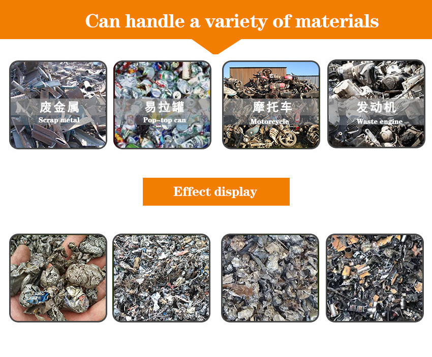 Дробилка для металлолома в основном используется для переработки и измельчения различных видов металлолома, таких как банки, цветная стальная плитка, списанные автомобили, бочки из-под краски и железная стружка. Тонкая обработка металлолома обеспечивает лучшие рентабельные показатели с точки зрения транспортных расходов и цены утилизации. В конструкции оборудования основной корпус изготовлен из сверхтолстой стальной пластины, а внутренняя облицовка выполнена из высокомарганцевой литой стали для защиты внешнего корпуса. В роторной части основного корпуса используется дисковый механизм вращения, на горизонтальной оси ротора установлены несколько стальных пластин (количество и диаметр стальных пластин зависят от модели), по окружности каждой пластины распределены 6 штифтов. Осевая подвеска имеет несколько молотковых головок для измельчения материала, главный вал поддерживается шариковыми подшипниками, циркулирующее масло обеспечивает принудительную смазку и охлаждение, а датчик температуры обеспечивает высокоскоростную и стабильную работу оборудования, а операция измельчения лома осуществляется за счет согласованной работы вышеуказанного корпуса и главного вала.